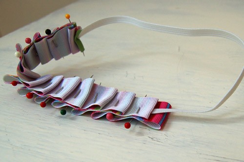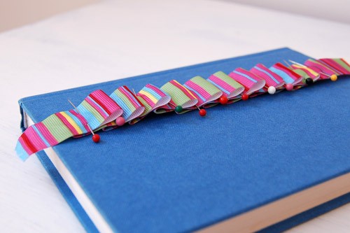 Шаг 1. Возьмите ленту в несколько раз длиннее, чем книга. Соберите ее гармошкой и зафиксируйте с помощью булавок.