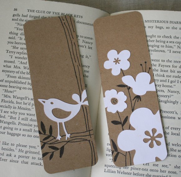 Шаг 4. На закладке нарисуйте простым черным маркером дерево, ветки, стебли и листья цветков. Сверху наклейте бумажные цветы и птичку. Вот и все!