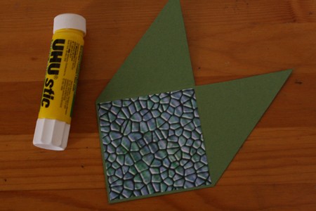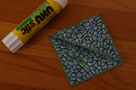 Шаг 6. Сложите одну треугольную часть внутрь, чтобы она перекрывала верхнюю половину квадрата. Нанесите немного клея и накройте сверху вторым треугольником.