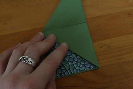 Шаг 6. Сложите одну треугольную часть внутрь, чтобы она перекрывала верхнюю половину квадрата. Нанесите немного клея и накройте сверху вторым треугольником.