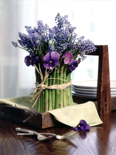 В таких композициях для декорирования вазы используются овощи, например, морковь или спаржа, которые выкладывают по периметру вокруг вазы, либо цветы можно разместить прямо внутри овоща, к примеру, капусты или артишока. Такое необычное декорирование будет главной деталью в сервировке стола или декоре интерьера.