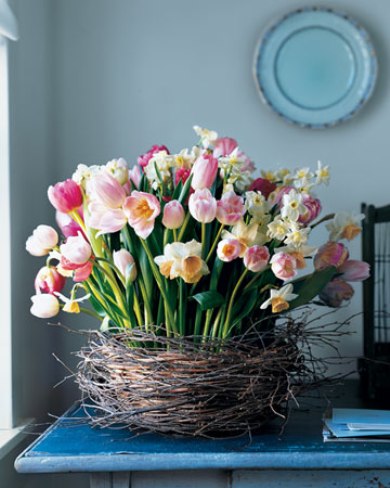 Такой прием особенно актуален весной, так как гнездо символизирует возрождающуюся природу, зарождение новой жизни. Для таких композиций эффектнее всего будут смотреться весенние цветы.