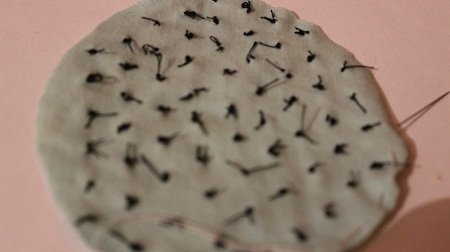 Закрепите и обрежьте нить. Определите расположение подбородка и глаз. Сделайте метки мелком.