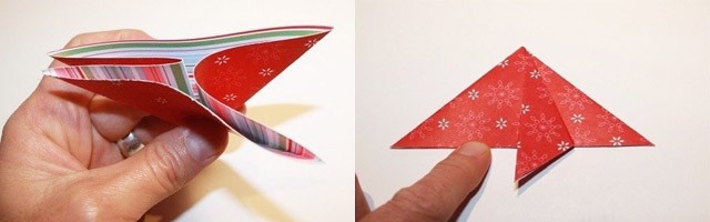 Нарезаем из цветной бумаги, можно упаковочной с узором, квадратики. Складываем их способом, показанным на изображении. Квадратики должны быть разных размеров. Сложив их все по схеме, получаем детали для создания елки.