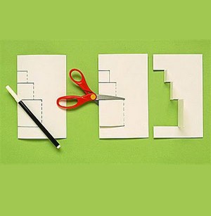 Расчерчиваем на сложенном листе бумаги форму трехъярусного подарка. Делаем горизонтальные разрезы, но не вырезаем детали до конца. Загибаем их внутрь.