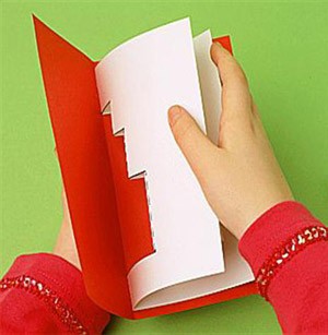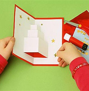 Намечаем место на открытке, где мы хотим поместить елку. Затем приклеиваем все детали в нужной очередности: снизу вверх в порядке уменьшения.
