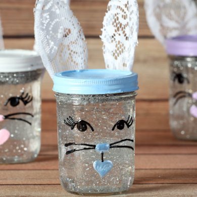 Сделайте каждого зайчика индивидуальным, разукрасив объемной краской мордочки, потом добавьте ушки и хвостик. Встряхните его, размешав воду и блестки, для получения эффекта стеклянного шара со снегом.