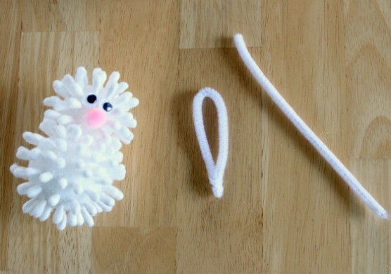 Разрежьте другую синельную проволоку пополам. Снова согните и скрутите концы. Это ножки кролика. Чтобы кролик стоял, концы проволоки скрутите несколько раз. А теперь всуньте в туловище кролика, чтобы прикрепить ножки.