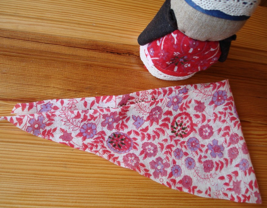 Основной платок из той же узорчатой ткани, что и передник. Вырезаем как платочек и повязываем поверх нижнего (очипка). Ткань лучше брать тонкую, тогда и платок красиво и легко завяжется. Из бечевки (или ленты) можете завязать пояс, но моя красавица от него отказалась.
