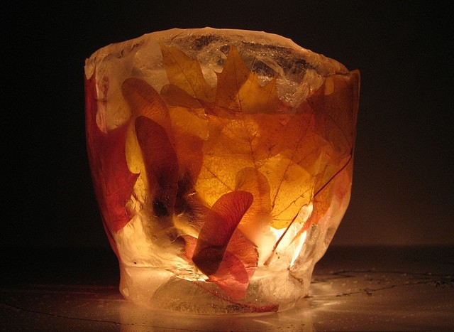 Если же вы хотите использовать подобную идею для внутреннего декора, это тоже не проблема. Берем гербарий, кладем в большую кухонную посудину, например, салатник. Внутрь вставляем салатник поменьше и заливаем водой. Кладем получившуюся конструкцию в полиэтиленовый пакетик и ставим на ночь в морозильную камеру. Получается вот такая красота: