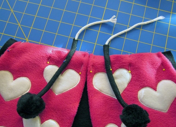 Изготавливаем усики божьей коровки с помощью небольших кусочков черной ткани и толстого шнурка, чтобы усики держали форму. Пришиваем в конце мягкие бубенчики, и усики готовы.