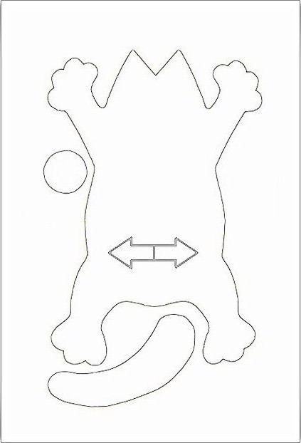 Как и прежде, нужно создать эскиз на бумаге, а потом перенести его на ткань. Нижняя часть кота является цельной деталью, а вот верхняя состоит из нескольких кусочков разных цветов.