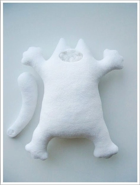 Затем вырезаем глаза, нос и пришиваем их к верхней части подушки. Чтобы начать соединять остальные детали, нужно изготовить четыре лапы, ушки и хвост. Их мы набиваем синтепоном или ватой, и пристрачиваем в тот момент, когда соединяем верхнюю деталь с нижней. Набивает кота синтепоном, аккуратно потайными стежками зашиваем отверстие и делаем усы из толстой нитки или лески.