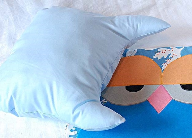Так же вырезаем две такие же заготовки из материала любого цвета, сшиваем их вместе и наполняем синтепоном. Таким образом, у нас есть готовая подушка, на которую можно удобно одеть будущую «сову».