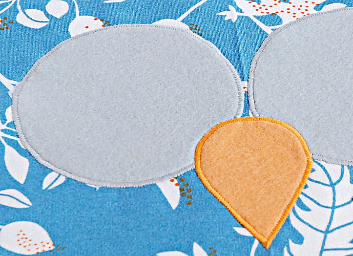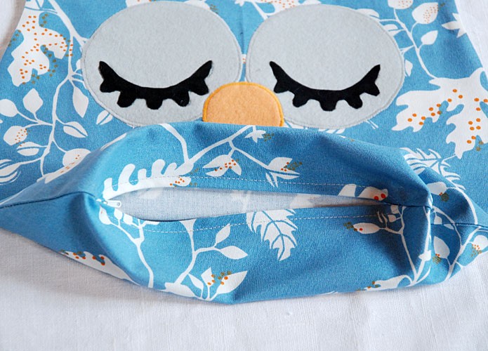 Возвращаемся к первым деталям из разной ткани. Прежде чем сшить их между собой, нужно вырезать детали глаз, клюва и лапки. Пришиваем детали на лицевой части совы, а лапки пристрачиваем во время соединения верхней и нижней детали тела.