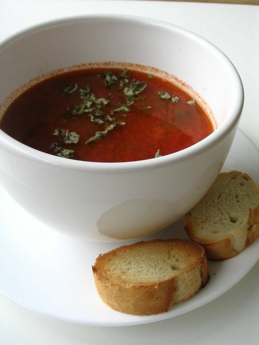 Ингредиенты: 3-4 помидора, натертые на терке (если вы готовите суп зимой, то можете использовать консервированные помидоры, перебитые в блендере), 1 неострый зеленый перец (такой как итальянский или банановый) или 1-2 мелко нарезанных маленьких красных перца, мелко нарезанных, 1 маленький зубчик чеснока, 1 столовая ложка оливкового масла, ¼ стакана риса, ½ чайной ложки паприки или красного молотого чили, ½ столовой ложки измельченного черного перца, 3 стакана горячей воды или бульона, соль, ½ пучка нарезанной петрушки.