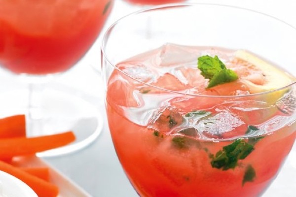 4. Процеживаем через ситечко, при необходимости, и разливаем по бокалам. Сверху добавляем немного минеральной воды. По желанию, украшаем мятой или долькой лайма.