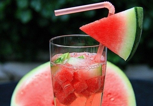 3. Переливаем коктейль в бокал со льдом и заливаем спрайтом до самого верха. Аккуратно размешиваем ложкой и украшаем долькой арбуза.