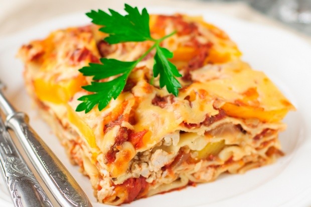 5. Смазываем дно формы для запекания оливковым маслом. Выкладываем слой теста для лазании, затем кладем нарезанный кубиками бекон. Следующий слой – грибное рагу, которое равномерно распределяем по всей форме. Сверху посыпаем сыром.