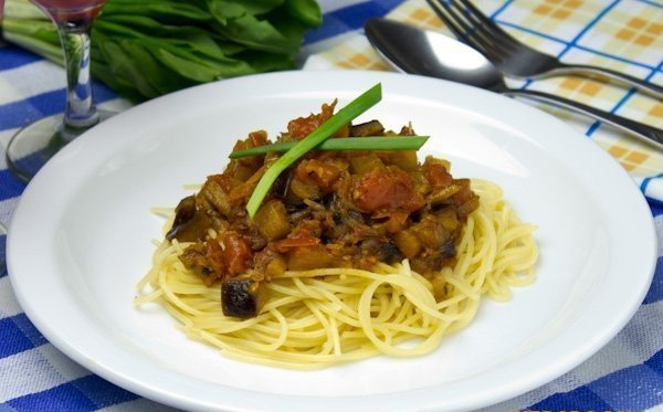 1. Солим воду и ставим пасту вариться. Тем временем, нарезаем лук, баклажан и кабачок небольшими кубиками. Перец Чили измельчаем.