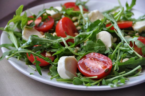 6. Выкладываем на тарелку листья рукколы, помидоры и поливаем заправкой собственного приготовления. Сверху салат посыпаем орешками и кусочками сыра. И наш сытный завтрак готов!