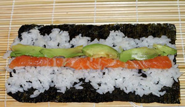 7. Сдвигаем лист нории вниз таким образом, чтобы нижняя линия коврика совпадала с линией водорослей. Кладем на рис полоску огурца, мясо краба и ломтики авокадо.