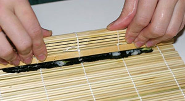 9. Приподнимаем край бамбукового коврика и с его помощью сворачиваем лист нори вперед, сохраняя мягкое давление.