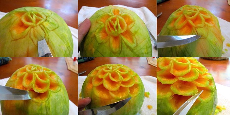 Используем острый нож, чтобы вырезать небольшой круг не верхней части дыни. Вырезаем глубокие маленькие насечки в центре круга, чтобы имитировать центр цветка. Затем используем нож, чтобы нарисовать контур первого ряда лепестков. Вырезаем каждый отдельный лепесток, выкапывая его серединку и останавливаясь на линии нашего круга.