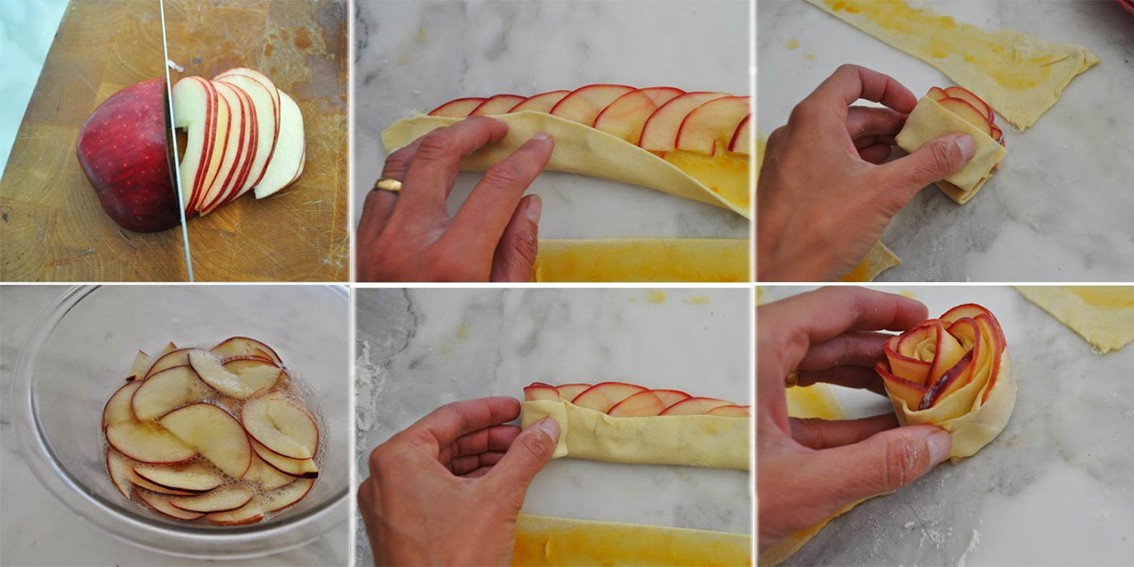 Затем раскатываем тесто тонким слоем и нарезаем полосками. Дольки выкладываем вряд на смазанное абрикосовым джемом или вареньем слоеное тесто, сворачиваем его, как на картинке, чтобы получилась розочка.