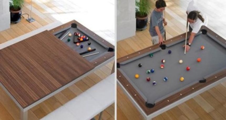 Стол – трансформер с выдвижным бильярдом, за которым вы можете есть, работать и развлекаться. Идея и исполнение напоминает дверь для настольного тенниса. Этот стол превратит вашу гостинную в игровую комнату и подарит много незабываемых моментов.