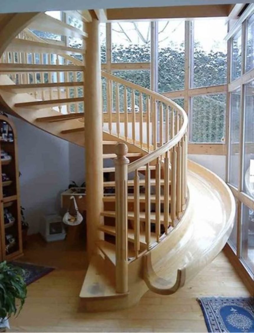 Винтовая лестница – полюбившийся многим красивый и практичный вариант, который объединяет два этажа, занимает мало места и отличается прекрасным дизайном. Но функционал лестницы возрастает в несколько раз, как только она комбинируется с детской горкой. И поверьте, не только дети оценят по достоинству этот молниеносный спуск.