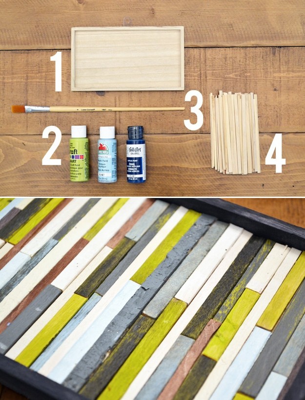 Для начала, покрасьте раму в цвет, которые будет гармонировать с интерьером вашей комнаты. Затем покрасьте все ложечки в разные цвета и дайте им высохнуть. Ложечки разрежьте на две части, чтобы одна была длиннее другой или пополам. И начните складывать их в раму, предварительно смазывая клеем. Регулируйте длину по необходимости. Потратив несколько часов, вы получите яркий и оригинальный акцент на стене.