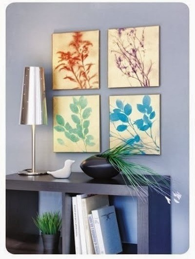Чтобы сделать такую картину, вам нужно предварительно собрать и подсушить листья. Воспользуйтесь старым добрым методом, известным еще со школы – положить листья в книгу, чтобы они стали плоскими, как бумага. Затем покрасьте холст в яркий цвет.