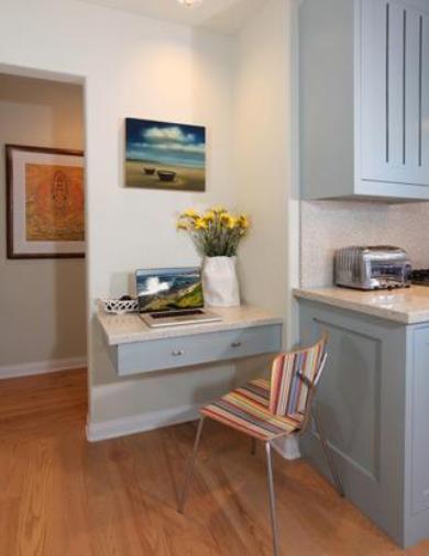 Этот вариант распространен меньше всего, в большинстве случаев из-за скромной площади кухонь. Но не стоит сразу отвергать его. Маленький рабочий столик для ноутбука, планшета или книги любимых рецептов приглянулся бы многим хозяйкам. Часто для этого выделяется часть столешницы или расширяется подоконник.