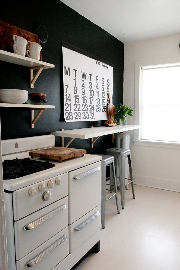 Барная стойка идеально подходит для узкой вытянутой кухни. С помощью нескольких кронштейнов и куска дерева, можно создать идеальное обеденное место возле окна, где будет приятно попивать утренний кофе.
