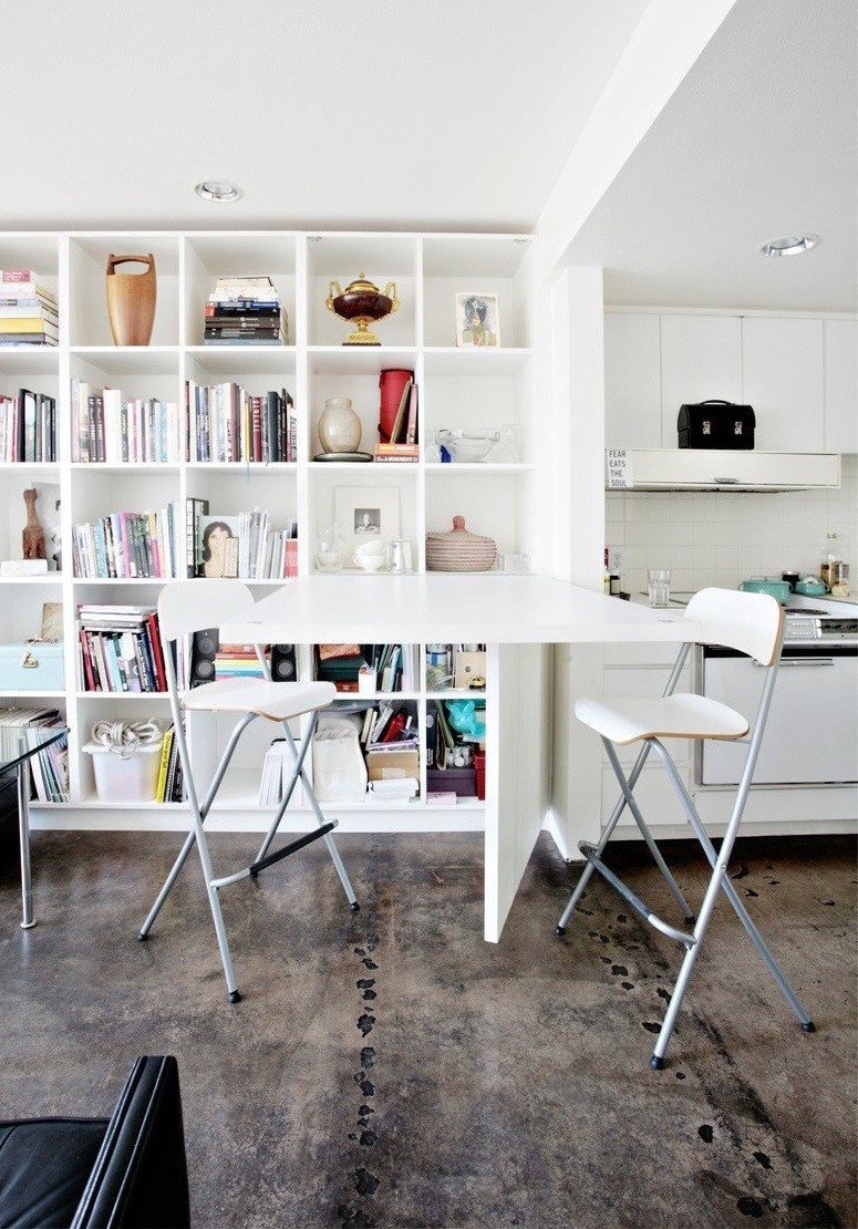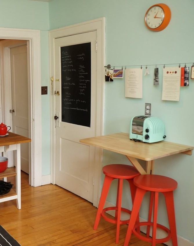 Для самых крохотных кухонь, наличие обеденного пространства, которое можно компактно складывать, когда оно не используется, это отличный компромисс. Воплотить эту идею в жизнь поможет складной столик или столешница, которая выдвигается из стены.