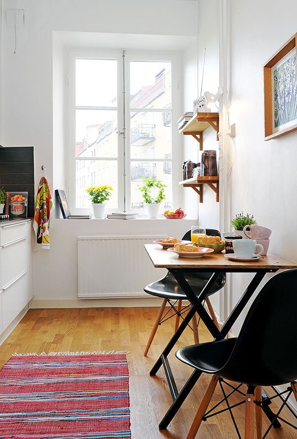 Если у вас есть свободный угол, чтобы сэкономить пространство, устройте в нем обеденную зону. Используйте скамью с нишами для кухонной утвари или мягкий уголок.