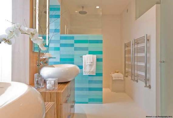 Этот цвет можно применить в ванной по-разному, подобрав нужный тон и оттенок. Чтобы подчеркнуть белоснежную ванную, превратив её в композиционный центр, бирюзовым расставляем акценты на стенах. Даже потолок может быть бирюзовым.