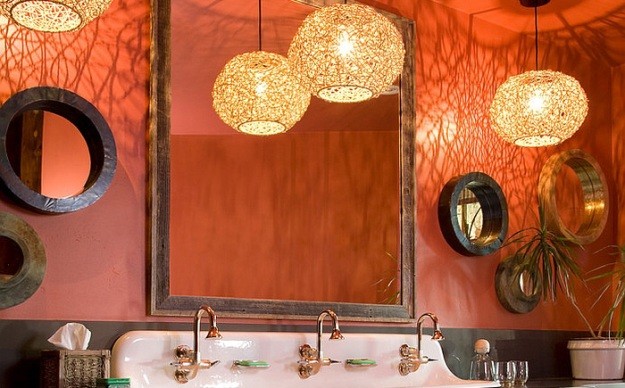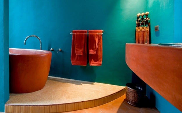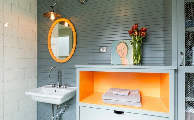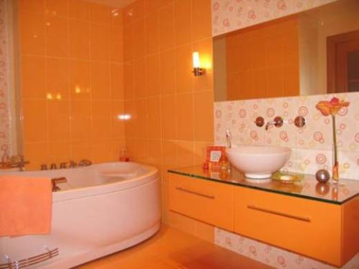 Помимо оттенков синего, для ванной комнаты отлично подойдут цвета, которые придают ей уютную и теплую атмосферу. И для такой обстановки отлично подойдет оранжевый цвет.