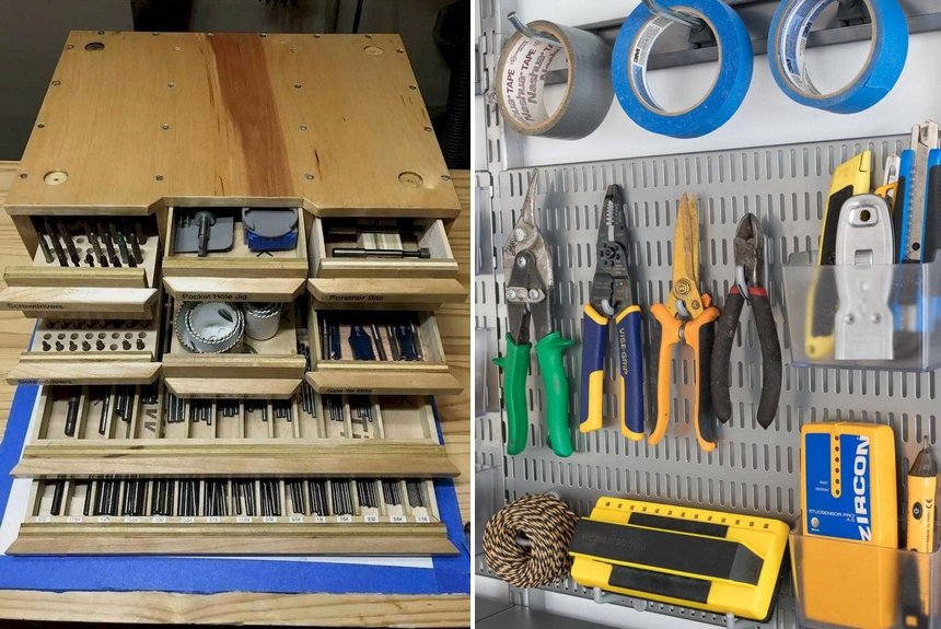 Чтобы с легкостью воплощать в жизнь проекты по реформированию жилища и выполнять небольшой ремонт, под рукой всегда необходимо иметь подходящие инструменты. Планки на стене (из металла или дерева) создадут дополнительное место для хранения, а также обеспечат свободный доступ к молотку и отверткам. Если ваш гараж по совместительству мастерская, в которой есть просторный рабочий стол, используйте пространство под ним, чтобы удобно разместить выдвижные ящики с инструментами. Даже лист фанеры, прикрепленный к стене, с организованными на нем крючками и креплениями, поможет привести в порядок разнообразные ключи, ножовки и пассатижи.