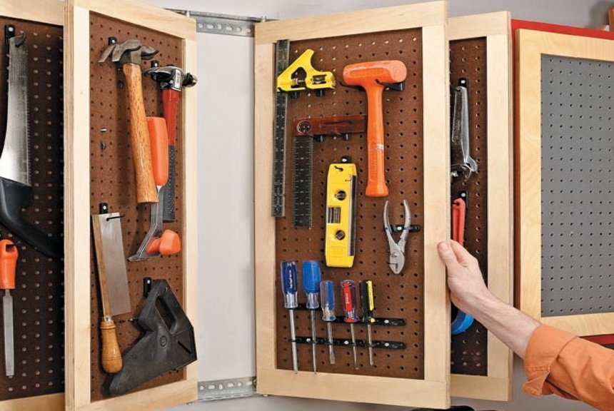 Подобная перфорированная панель (или пегборд) часто служит выставочным стендом в строительных магазинах, на котором демонстрируется ассортимент товаров. Но ввиду своей практичности такая полезная вещь давно "перекочевала" в частные гаражи и мастерские. К тому же, для настоящего (или начинающего) мастера не составит труда соорудить это приспособление самостоятельно. Основой для панели может послужить металлический лист или плотный лист фанеры, ДВП, МДФ. Просверлив необходимое количество отверстий, на такой стенке удастся компактно разместить весь малогабаритный инструментарий, туристическое снаряжение, элементы одежды и др.
