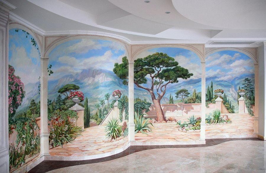 Чаще всего заказчики интересуются нанесением пейзажей, элементами древнеримской или древнегреческой культуры. Помните фреску, где волны, море, пена и фигуристая Афродита выходит из воды, закутавшись в длинную косу? Такой рисунок можно заказать у мастера и использовать в ванной. Или украшение зала в виде беседки. Создается иллюзия, что ваши гости находятся на свежем воздухе, поют птички и дует легкий бриз.