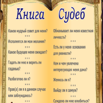 Самое простое гадание, не требующее особых навыков, но тоже, довольно точное. Чаще всего в данном виде гадания используется, как ни странно, Библия. Но это не важно. Главное, чтобы эта книга была авторитетной для вас. Мне, к примеру, удобно использовать книгу афоризмов, цитат или просто оракул. Тут также необходимо развитое творческое начало, чтобы правильно понять ответ. Но все приходит с опытом! Вы можете не получить прямого ответа, но зато, это гадание одно из самых интересных и приятных!