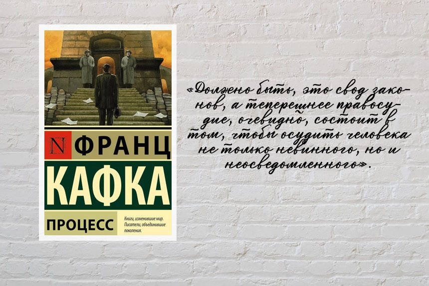 Лучший роман Кафки и одно из величайших произведений классической литературы был опубликован уже после смерти автора, в 1925 г. Работа над книгой тяжело давалась писателю. Созданию «Процесса» предшествовала личная драма — расставание с невестой, после чего в полном уединении Кафка непрерывно работал двамесяца. На двухсотой странице роман остановился и так и не был закончен. Фабула произведения базируется на противостоянии человека и системы. Однажды Йозеф К. просыпается и обнаруживает, что проходит обвиняемым по делу, но вот никто (как и сам Йозеф) не знает, в чем именно он виноват.