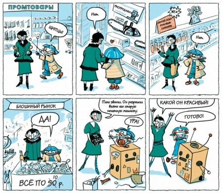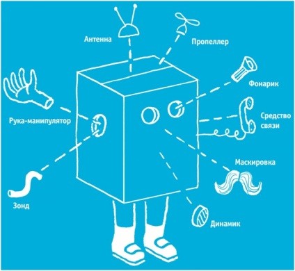 Все, что вам понадобится — книга-инструкция от известного детского художника Вивьен Шварц «Я — робот» и ребенок, мечтающий стать конструктором. А в итоге получится настоящая уникальная модель робота. И такой не будет больше ни у кого.
