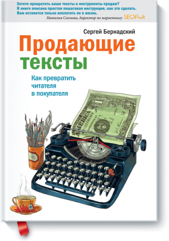 Автор предлагает кардинально новый подход к писательскому делу. Она рассказывает скорее, о нейрофизиологии писательского искусства, а не о том, как правильно писать. Как известно, за творчество отвечает правое полушарие мозга. Капаччионе предлагает воспользоваться простым психологическим приемом активизации этого полушария: начать писать другой рукой (для правшей – левой, для левшей – правой).6. «Продающие тексты», Сергей Бернадский