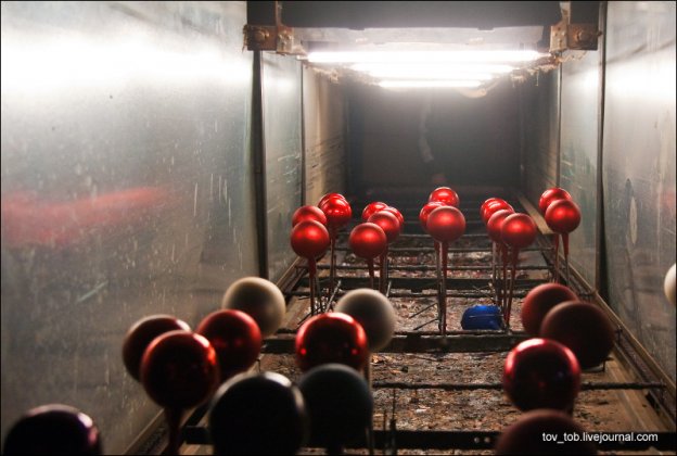Третий этап – окрашивание игрушки. Посеребренные шарики обмакиваются в краску и отправляются в печь.