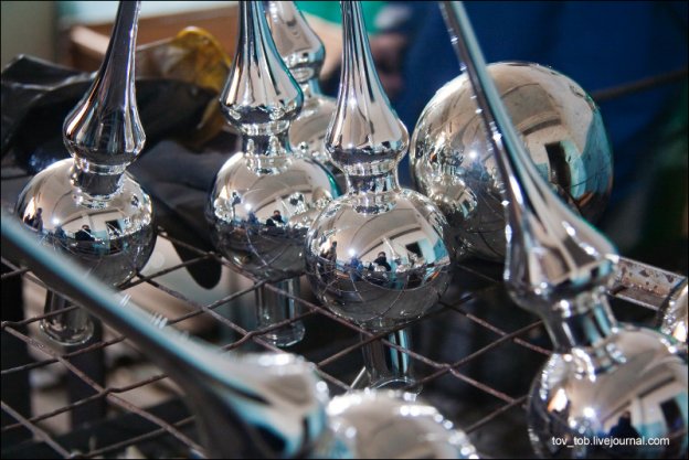 Второй этап – это серебрение. Прозрачный шарик окунают в специальную емкость с реактивами, а внутрь шара вливается раствор, который состоит из аммиака, дистиллированной воды и оксида серебра. Затем шарик помещается в горячую воду, где происходит реакция «серебряного зеркала». Оставшийся раствор стряхивается.