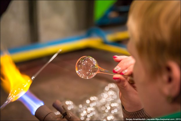 Первый этап – выдувание из полой стеклянной трубки определенного диаметра шара или фигурной игрушки. Трубка разогревается с помощью газовой горелки и стеклодув выдувает шар, постоянно вращая трубку. Опытные стеклодувы легко могут рассчитать количество воздуха и выдуть шарики, необходимого диаметра. За смену стеклодув выдувает приблизительно 150-200 шариков.