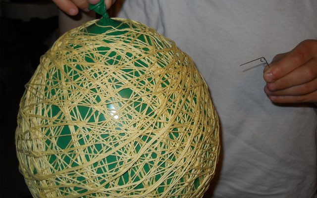Д) Когда вы убедитесь, что нитки полностью высохли, протыкаем шарик иглой и вытаскиваем его через отверстие. Остается красивый каркас из ниток.
